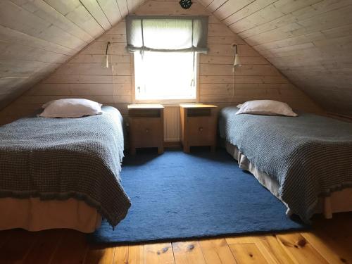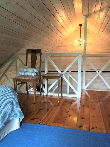 Alla smakfullt inredda rum på Sjöbacken Gård har ett sovloft, en TV samt badrock och tofflor. Badrum delas med de andra gästerna.