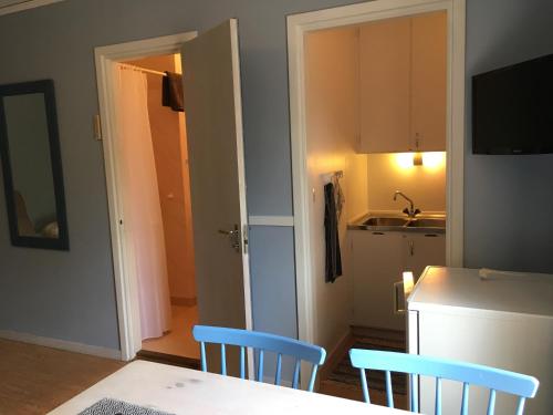 Detta rum har en mikrovågsugn, en te- och kaffekokare och ett kylskåp.