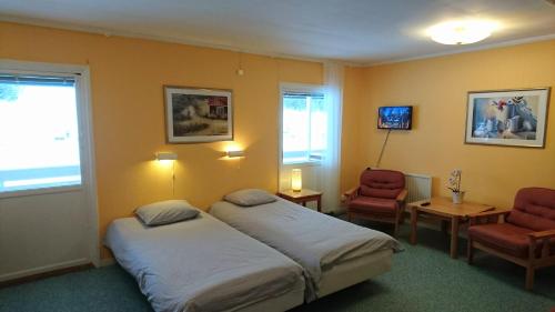 Detta tvåbäddsrum har sittgrupp och egen toalett. Dusch finns i korridoren utanför rummet.