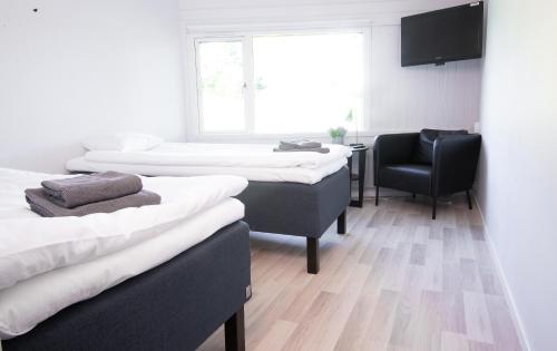 Detta tvåbäddsrum har ett litet bord, en skinnfåtölj och en platt-tv. I det egna badrummet finns toalett och dusch.